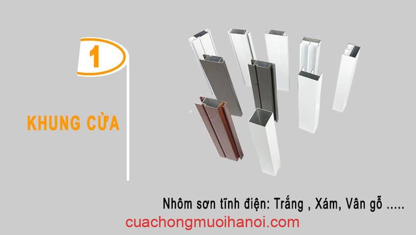 Khung cửa được sản xuất từ khung nhôm định hình cao cấp, sơn mạ kẽm tĩnh điện bên ngoài dùng để căng lưới inox 304 được gắn cố định vào khung cửa. Khung cửa có màu sắc đa dạng như: màu ghi, màu vân gỗ, màu trắng sứ, màu đen… Khung cửa có độ cứng cao giúp giữ lưới chống muỗi ở trạng tái căng và giúp cửa luôn bền đẹp, sáng bóng với thời gian.
